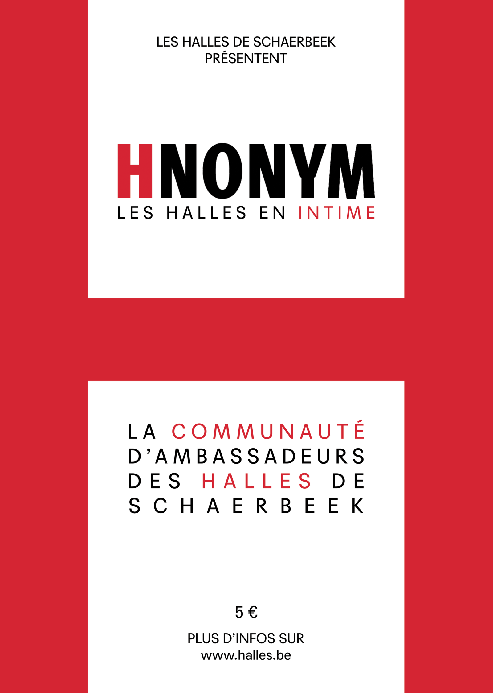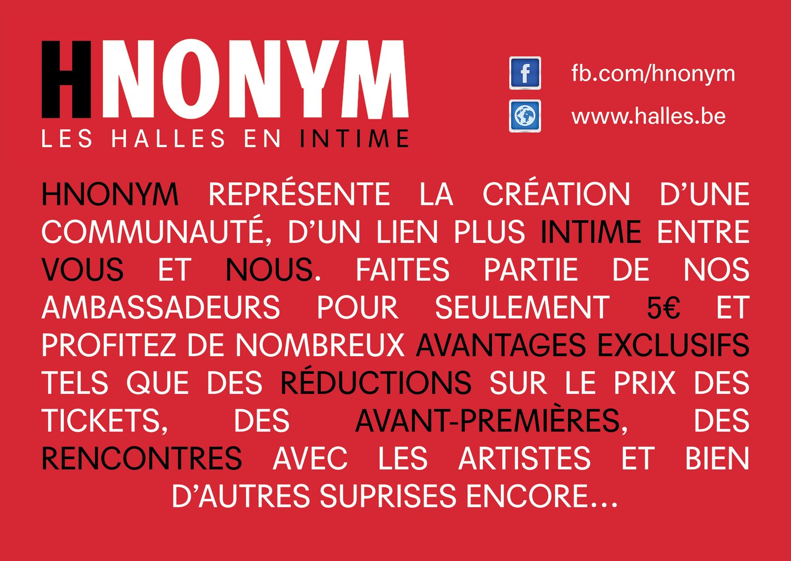 Création de l’identité visuelle et du concept HNONYM, une communauté de membres privilégiés imaginée pour renforcer le lien entre le public et Halles de Schaerbeek.